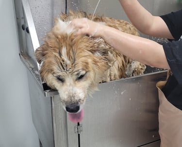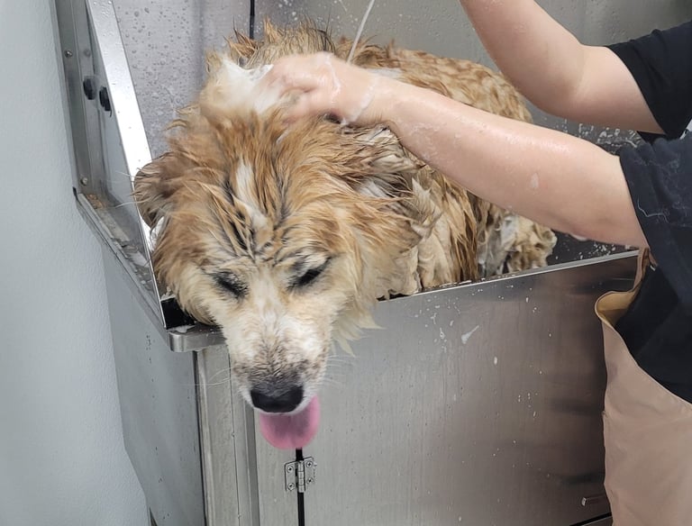 Our bathing services include relaxing shampoo and conditioner, teeth brushing, nail trim and buff, ear cleaning, paw balm, and leave-on conditioner. Optional cologne